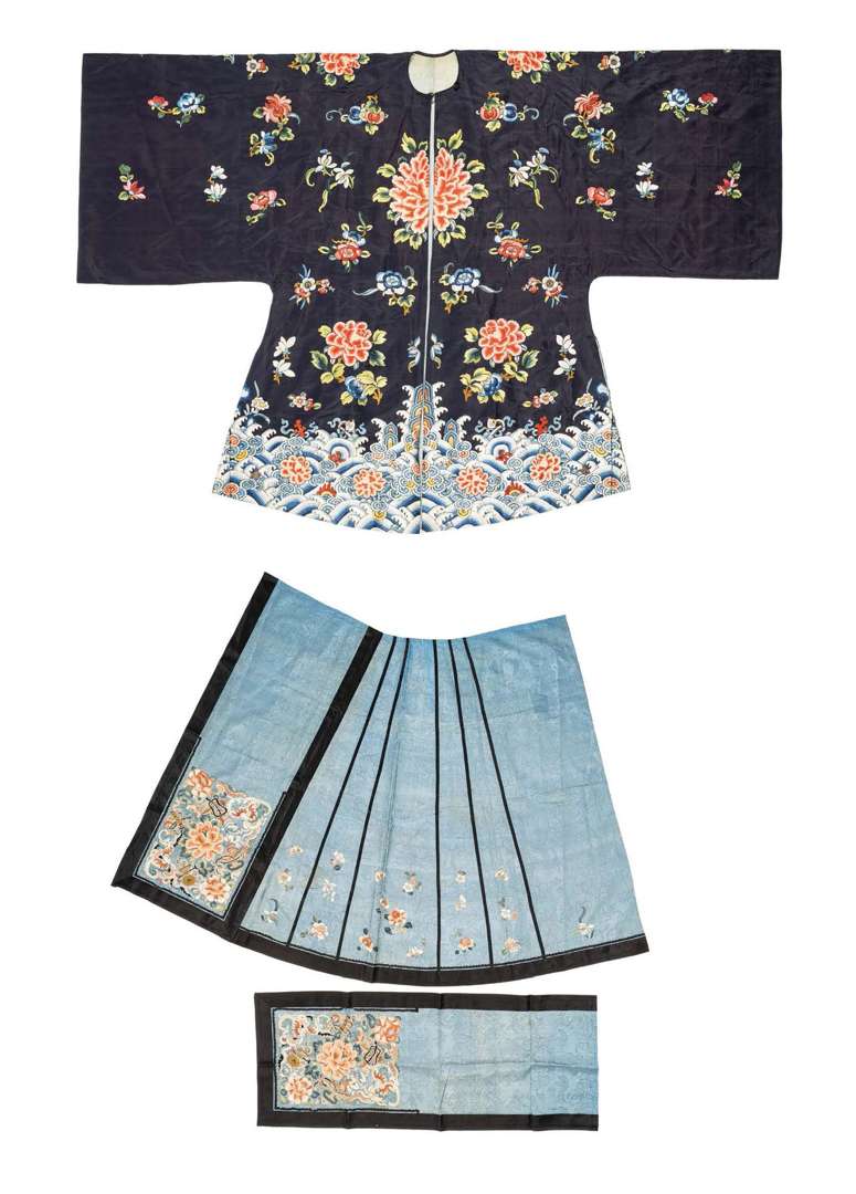 On y joint un pan de jupe brodé à décor de fleurs (et une chute de tissu brodé.)