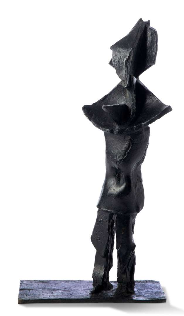 Germaine Richier sculptrice française reconnue mondialement, s’inscrit dans le renouvellement de la sculpture aux côtés d’Alberto Giacometti et Marino Marini. Après une formation classique à l’École des Beaux-Arts de Montpellier, elle intègre l’atelier d’Antoine Bourdelle à partir de 1926 où elle croise Alberto Giacometti qui recevait les enseignements du maître entre 1922 et 1925. Ses œuvres de jeunesse sont assez académiques et elle travaille particulièrement le buste. Tout au long de sa vie, elle s’appuiera sur la triangulation, méthode appliquée par Bourdelle qui permet de diviser la forme en triangle par le dessin sur le modèle vivant. L’importance des articulations en tant qu’axes de construction et de la forme est une leçon de Matisse qu’elle a assimilé| les repères qu’elle trace sur ses dessins indiquent la structure du squelette, et de nombreuses lignes quadrillent les corps. Germaine Richier bénéficie dès sa jeunesse de la reconnaissance des milieux artistiques, elle reçoit la médaille d’honneur de l’Exposition universelle de 1937 à Paris, et participe à la foire internationale de New York de 1939. Durant la guerre, elle quitte Paris pour s’installer à Zurich. C’est à partir de 1940, qu’une nouvelle esthétique s’annonce dans sa production avec la sculpture Le Crapaud qui mêle l’homme et l’animal. Elle s’éloigne de la tradition illusionniste pour tendre vers de nouveaux modes de figuration engendrés par le contexte socio-politique de la guerre. Au lendemain de la Seconde Guerre mondiale, l’Homme est remis en question dans son essence même. Les valeurs humanistes se sont effondrées, et plusieurs artistes travaillent à la construction d’une nouvelle vision de l’humanité. En 1953, Germaine Richier est installée à Saint-Tropez et cette période marque un renouveau dans son approche. Le Guerrier n°3 appartient à cette production très particulière. Germaine Richier se sert de la matière pour apporter mystère et étrangéité à ses sculptures. Les angles pointus et les arêtes aiguisées de cette figure nous renvoient à sa nature guerrière, laissant donc cette œuvre dans le champ de la figuration. L’enseignement de Bourdelle et l’héritage de Rodin sont visibles dans cette œuvre qui l’inscrit dans une continuité de la sculpture figurative, tout en y opérant des ruptures stylistiques et thématiques indéniables.