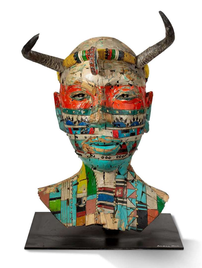 Sculpture en bois peint et clous de tapissiers, signée en bas à droite de la base