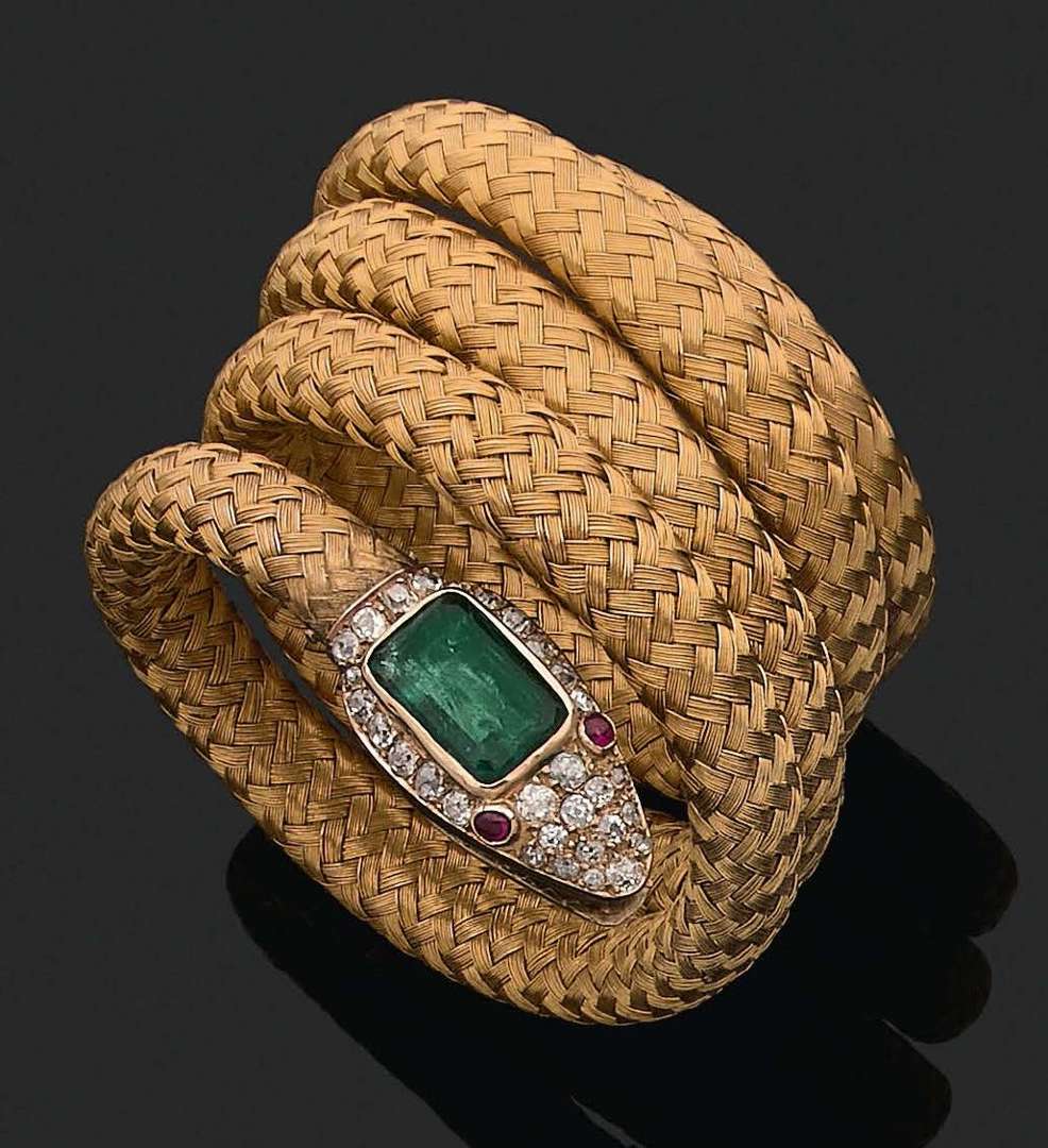 Émeraude, diamants taille ancienne, rubis cabochons