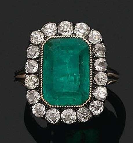 Émeraude rectangulaire à pans coupés, diamants taille ancienne