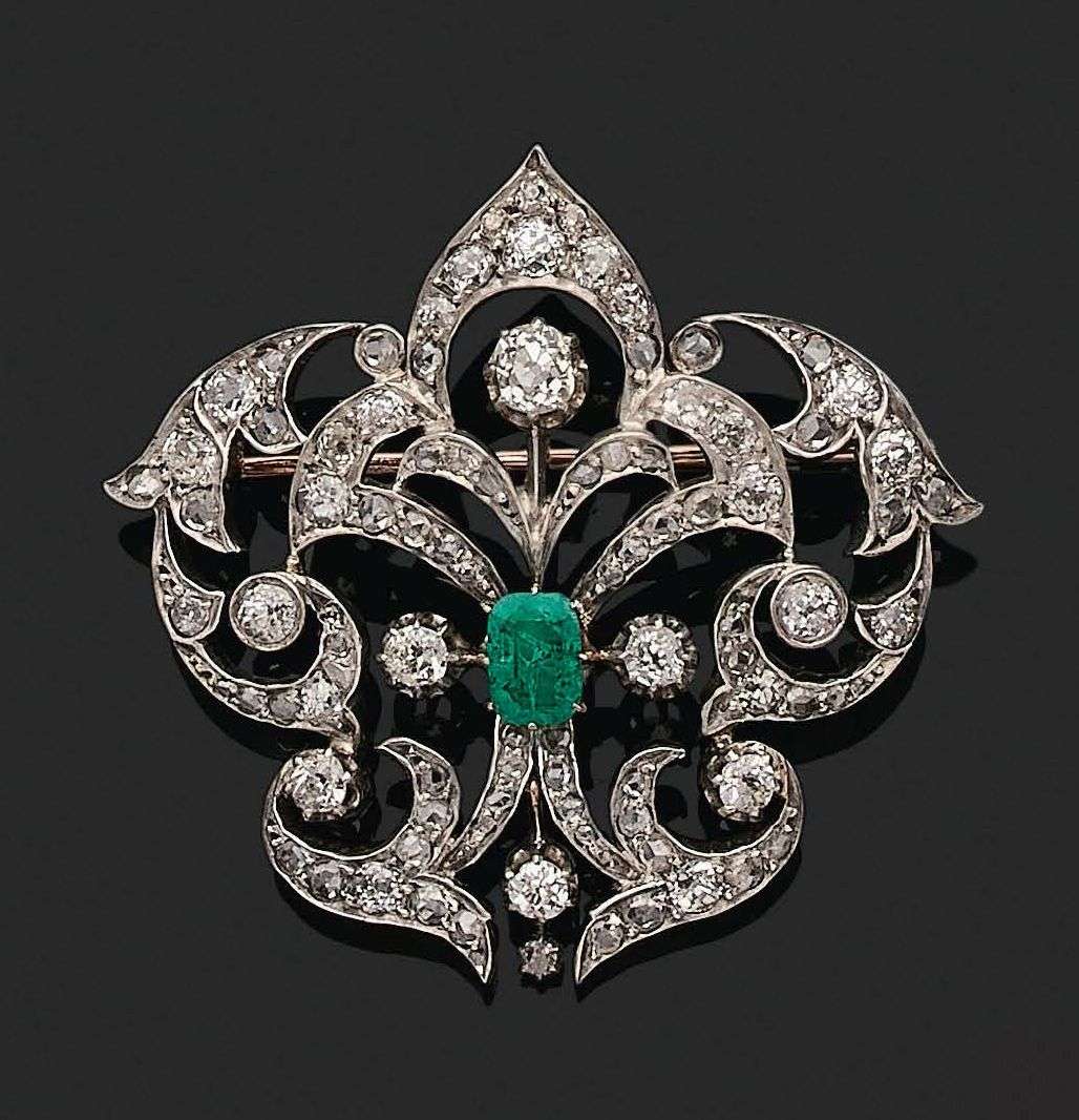 A diamond, emerald and gold brooch