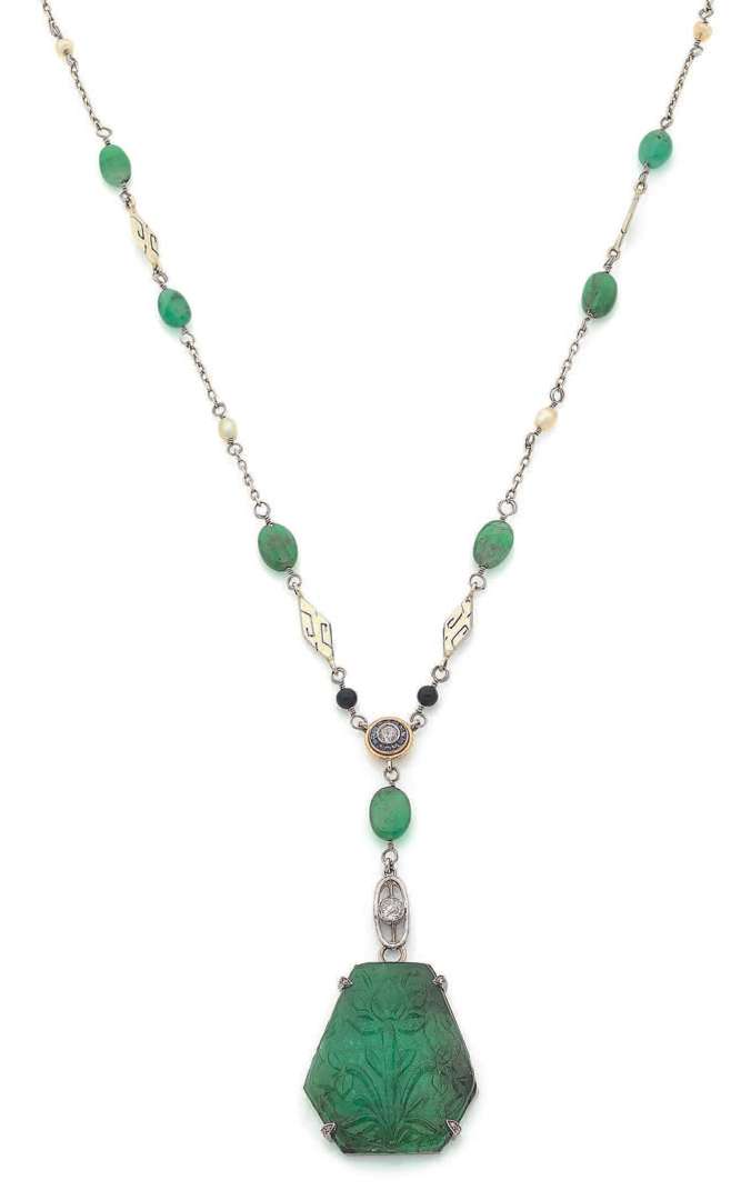 Émeraude gravée d'une fleur, diamants taille ancienne, onyx, saphirs, émeraudes et perles supposées fines