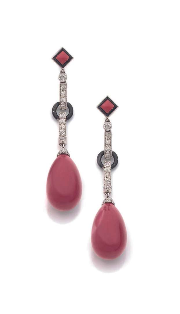 An enamel, coral, diamond, platinum and gold earrings