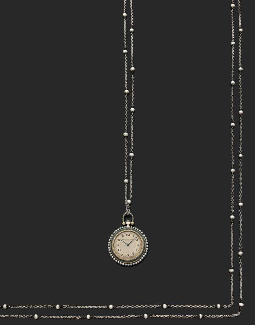 MONTRE DE DAME. Émail bleu gris, perles fines. Or 18k (750) et platine (950) pour la chaine. Signée sur la cadran et numérotée. Travail français - vers 1920. Diam. : 2.9 cm - Pb. : 35.7 gr
