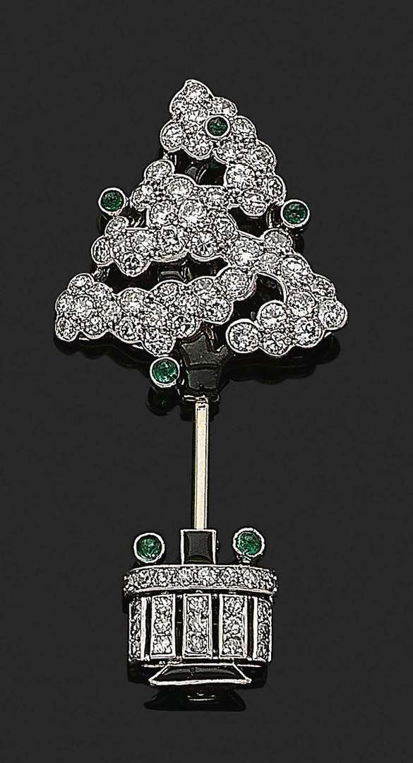 A diamond, emerald, enamel, platinum and gold pin