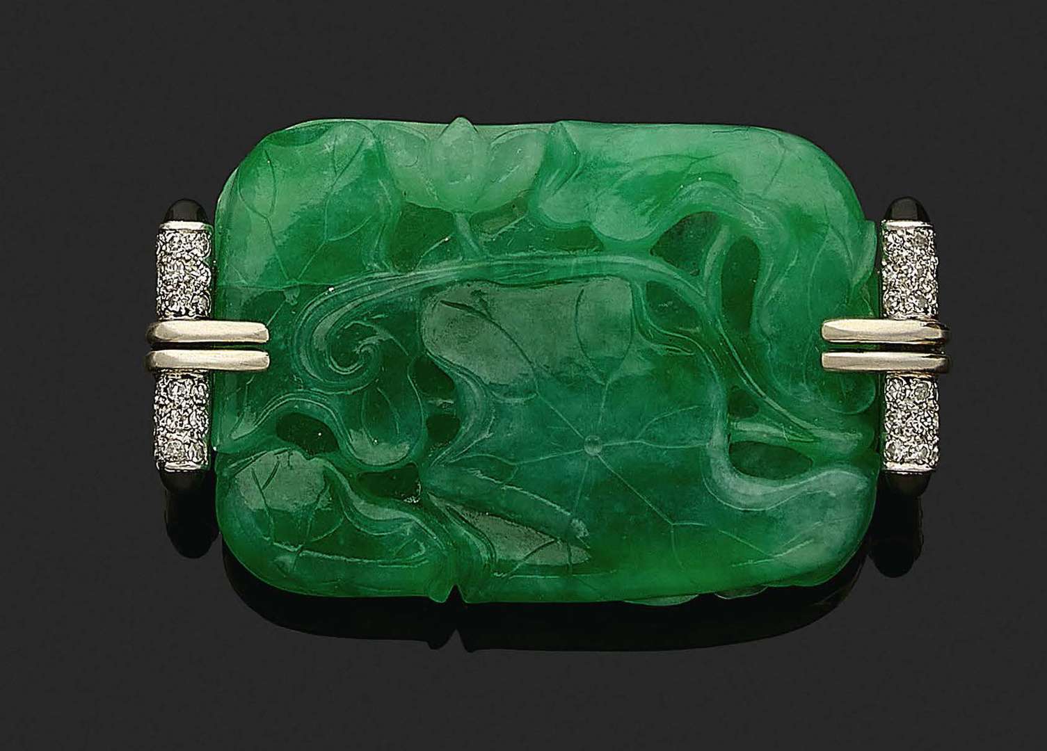 A jade, diamond, onyx and gold brooch by Suzanne Belperron. Stamped, report and certificate