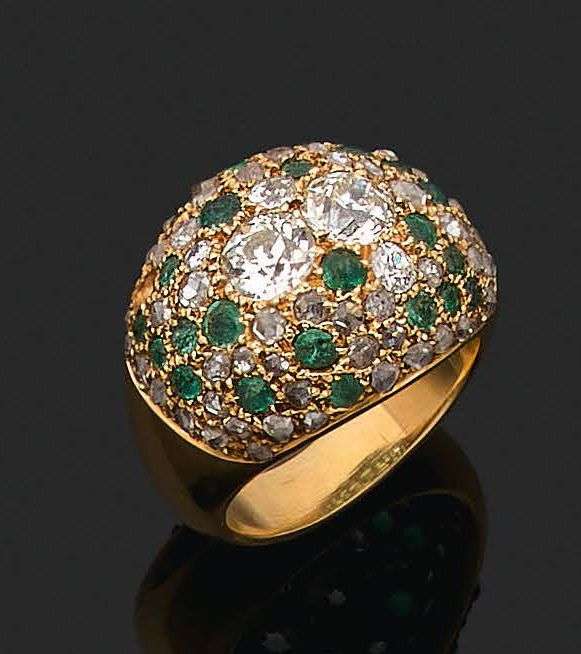 *BAGUE «BOULE» Diamants taille ancienne, diamants taille rose et émeraudes. Poinçon de maitre Groene and Darde. Td. : 59 - Pb. : 13.7 gr. Accompagnée d'un certificat d'authenticité de Monsieur Olivier Baroin précisant que cette bague fut commandée en octobre 1945. Conservée dans la famille jusqu'en 2014. Vente Aguttes le 9 dec 2014. Bibliographie: Suzanne Belperron par Olivier Baroin et Sylive Raulet Bibliothèque des Arts