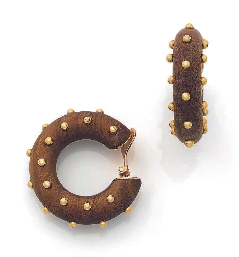 A wood and gold earrings by René Boivin, stamped René Boivin