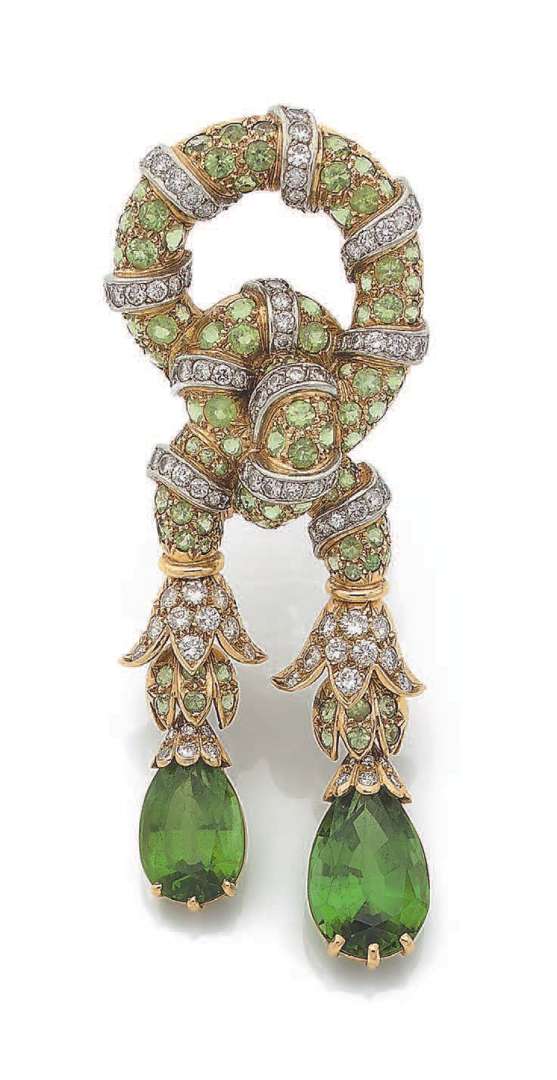 CLIP «NOEUD DE PASSEMENTERIE» Or 18k (750), diamants ronds et péridots. Poinçon de maître partiellement lisible Roger Davière. H. : 9 cm - Pb. : 56.1 gr. A diamond, peridot and gold clip by Rene Boivin, stamped