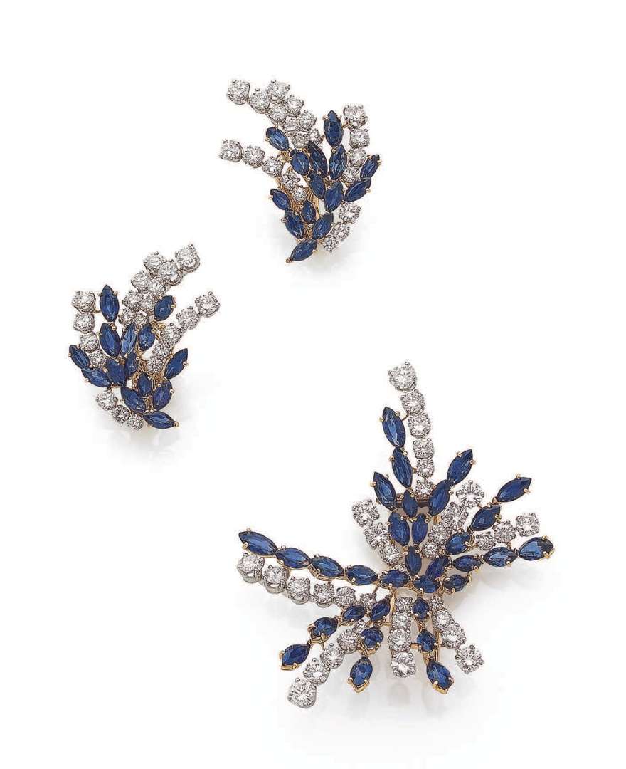 ENSEMBLE PAIRE DE CLIPS D'OREILLES ET CLIP. Diamants ronds taille brillant, saphirs taille navette. Or 18k (750), platine (950). Signé et numéroté - Poinçon de maître. L. clips : 3.6 cm env. - L. broche : 6 cm env.