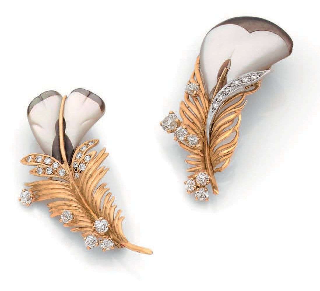 BROCHE «PLUME» Nacre, diamants taille ancienne. Or 18k (750) et platine (950) Signée. H. : 4.5 cm env. - Pb. : 5.6 gr. On y joint une broche sur le même modèle non signée