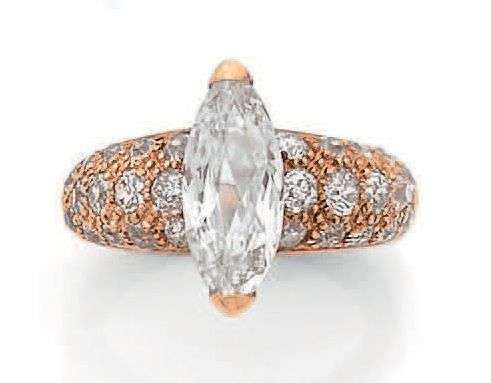BAGUE «DIAMANT NAVETTE» Diamants taille ancienne et navette. Or 18k (750) Signée. Td. : 53.5 - Pb. : 8.9 gr. A diamond and gold ring, signed Chaumet