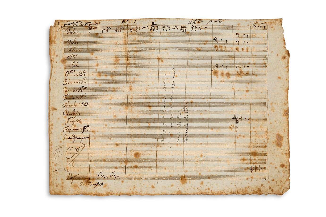 Si Bellini a inscrit en marge de l'armature, en italien, le nom de tous les instruments de son orchestre, seuls interviennent ici les violons I et II, les altos, les hautbois, le basson solo, les violoncelles et contrebasses | l'intervention de la flûte a été grattée.