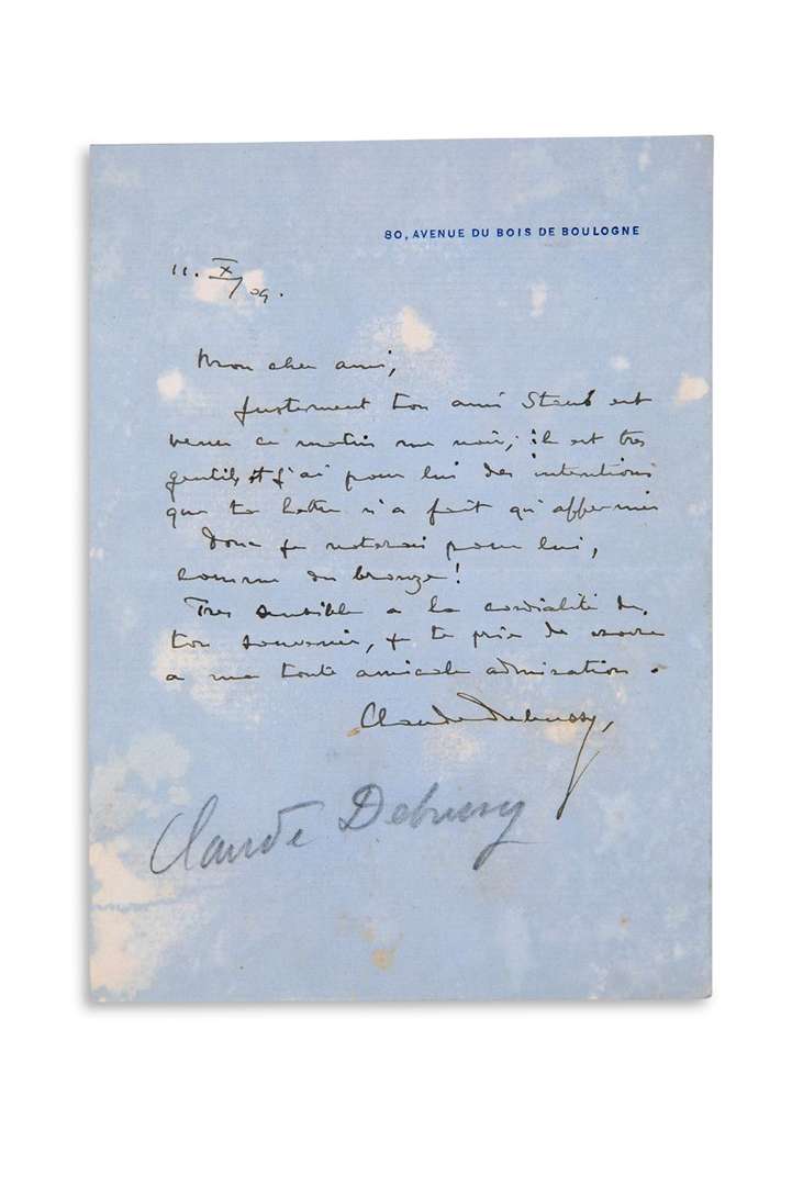 L.A.S. « Claude Debussy », 80, avenue du Bois de Boulogne [Paris] 11 octobre 1909, à un ami [probablement Paul DUKAS] | ¾ page in-12 sur papier bleu à son adresse (légères décolorations du papier).