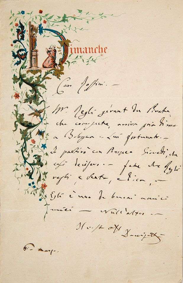 ROSSINI | 1 page in-8 ornée d'une jolie lettrine chromolithographiée au mot Dimanche, adresse | en italien.