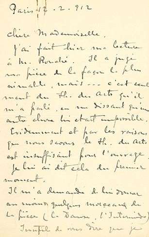 [La Vie brève fut créée au Casino municipal de Nice le 1er avril 1913, dans une matinée offerte aux abonnés du Figaro, puis à l'Opéra-Comique de Paris le 7 janvier 1914.] 12 février 1912. Jacques ROUCHÉ a jugé sa pièce de la façon la plus aimable, mais a parlé seulement du Théâtre des Arts, qu'ils savent être « insuffisant pour l'ouvrage ». « Il m'a demandé de lui donner au moins quelques morceaux de la pièce (la Danse, l'Intermède). Inutile de vous dire que je n'ai pas consenti. Je suppose que M. Rouché vous aura parlé de lecture, ainsi qu'à M. Lalo [...]. Je pense toujours à la mort de Salud, suivant vos indications et celles de M. Lalo. Demain j'irai consulter mon médecin à ce sujet pour pouvoir faire le travail en toute conscience »...