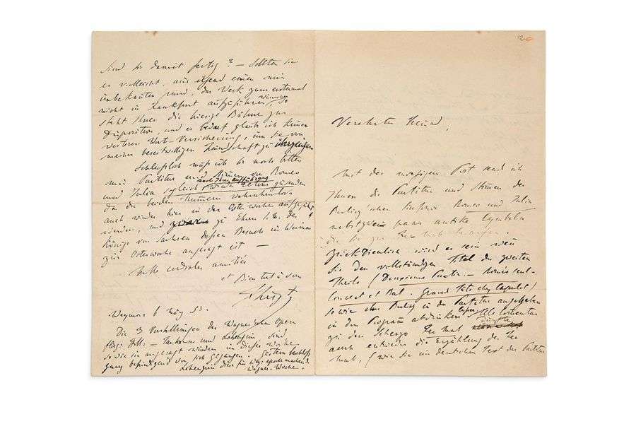 Puis il évoque le projet de représenter Der Lustige Rath [de J. Hoven, pseudonyme de Johann Vesque von Püttligen] à Francfort dans l'été | il parle aussi de l'opéra de Raff [König Alfred], et demande à Schmidt s'il a terminé son opéra : s'il ne souhaite pas en donner la première à Francfort, il met la scène de Weimar à sa disposition... Il demande de lui renvoyer la partition et les parties de Roméo et Juliette immédiatement après la représentation, car les deux numéros seront probablement joués à nouveau à Weimar pendant la semaine de Pâques, en l'honneur de SM le roi de Saxe...