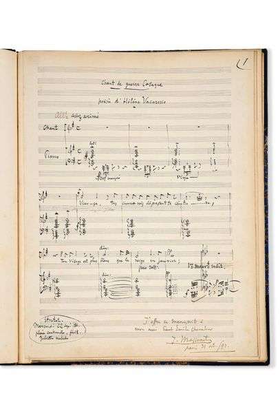 MANUSCRIT MUSICAL autographe signé « J. Massenet », Chant de guerre cosaque, 1886 | 5 pages in-fol. (paginées 1-6 avec une page 4/5) montées sur onglets et reliées en un volume demi-chagrin bleu marine à coins (Ch. Maillet).