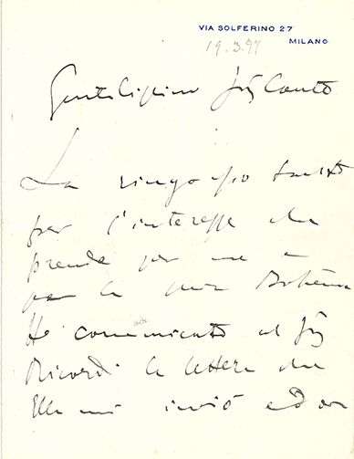 Il le remercie pour l'intérêt qu'il porte à sa Bohême [créée le 1er février 1896 au Teatro Regio de Turin]. Il a envoyé à Ricordi sa lettre | ils verront ce qu'ils peuvent combiner pour cet acteur qui intéresse tant le comte...