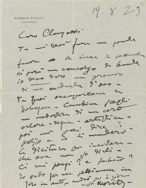 L.A.S. « Giacomo Puccini », Viareggio 19 août 1923, à Carlo CLAUSETTI | 2 pages in-4 à son en-tête | en italien.