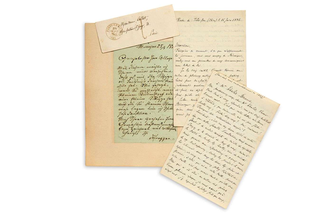 On joint une L.A.S. de Maurice LOIR, Rade de Tche-fou (Chine) 26 juin 1884, envoyant la copie d'une lettre de Béranger à Thalès Bernard, avec enveloppe autographe de BÉRANGER à Louise Colet (29 sept. 1843).