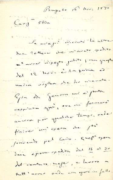 Le Caire [Aïda] « ove mi fermer. ancora per qualche tempo, onde finire un'opera che sto scrivendo per il Cairo »). Il doit l'envoyer entre le 15 et le 20 de décembre, et il travaille sans relâche pour ne pas se mettre en retard. Il ira aussitôt après à Gênes, où il restera, comme d'habitude, jusqu'à la fin de l'hiver. Si Obin vient à Gênes, Verdi lui donnera toutes les informations sur les théâtres d'Italie. Si Obin vient chanter en Italie, Verdi lui conseille de trouver un théâtre qui ne soit pas trop grand, pour qu'on puisse voir son jeu de physionomie, sans rien perdre de son grand talent d'acteur. Dans les théâtres trop grands, comme le San Carlo, la Scala, le Pagliano, tout se perd, il ne reste que la voix... (« Intanto se voi cantate in Italia cercate che il teatro non sia troppo vasto, onde si possa vedere il gioco di fisionomia e non perdere nulla del vostro grande talento d'attore. Nei troppo vasti teatri del S. Carlo, La Scala, il Pagliano tutto si perde, non resta che la voce.... »)