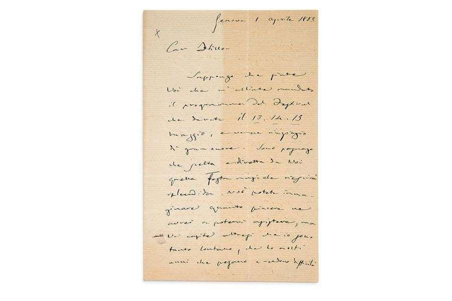 L.A.S. « G. Verdi », Gênes 1er avril 1883, à Ferdinand HILLER | 3 pages in-8 (la 1re en partie jaunie) | en italien.