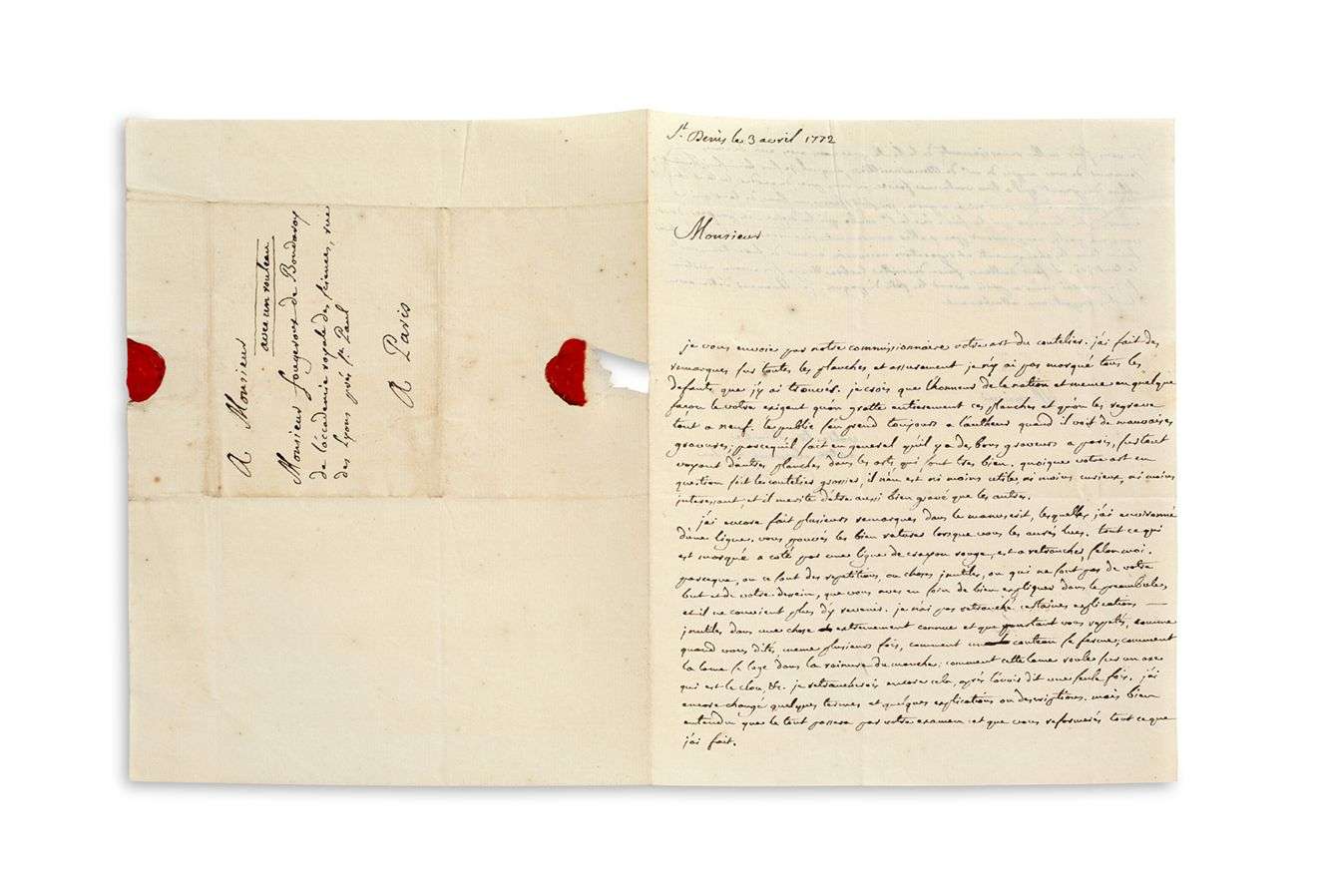 FOUGEROUX de BONDAROY de l'Académie des Science | 1 page et demie in-4, adresse avec cachet de cire rouge (brisé).