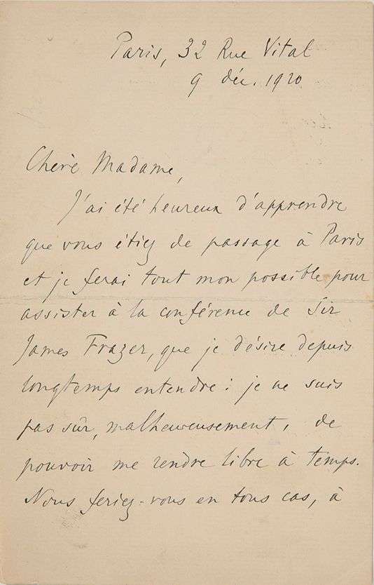 Frazer, que je désire depuis longtemps entendre | je ne suis pas sûr, malheureusement, de pouvoir me rendre libre à temps ». Il l'invite à venir prendre le thé lundi avec Sir James Frazer... [James George FRAZER (1854-1941), anthropologue écossais, auteur du Rameau d'or.]