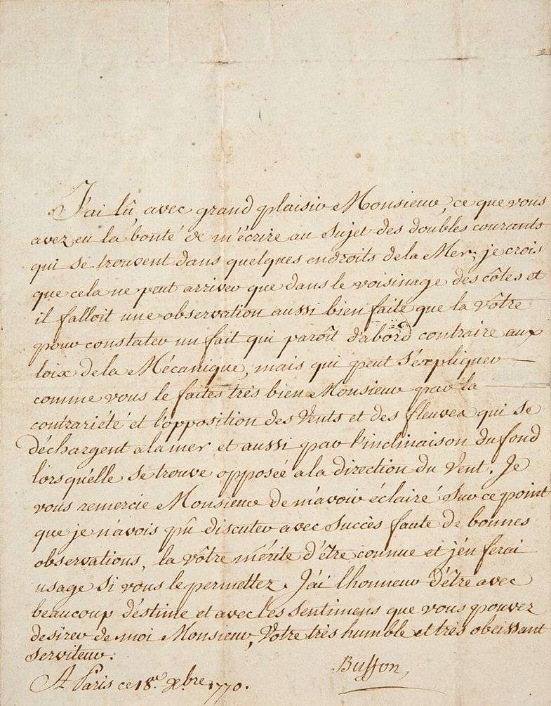 Très intéressé par les courants maritimes, Buffon a reçu le 6 décembre 1770 une lettre de Deslandes, navigateur breton, qui lui a fait part de ses observations « au sujet des doubles courants qui se trouvent dans quelques endroits de la Mer | je crois qu'il falloit une observation aussi bien faite que la vôtre pour constater un fait qui paroît d'abord contraire aux loix de la Mécanique, mais qui peut s'expliquer comme vous le faites très bien Monsieur par la contrariété et l'opposition des vents et des fleuves qui se déchargent à la mer et aussi par l'inclinaison du fond lorsqu'elle se trouve opposée à la direction du vent »... Il remercie Deslandes de l'avoir « éclairé sur ce point que je n'avois pû discuter avec succès faute de bonnes observations, la vôtre mérite d'être connue et j'en ferai usage, si vous le permettez »....