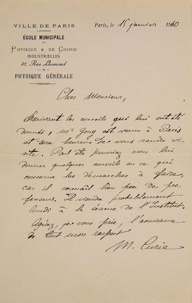« Suivant les conseils qui lui ont été donnés, Monsieur Gorey est venu à Paris et sera heureux de vous rendre visite. Peut-être pourriez-vous lui donner quelques conseils en ce qui concerne les démarches à faire, car il connaît bien peu de professeurs. Il viendra probablement lundi à la séance de l'Institut »...