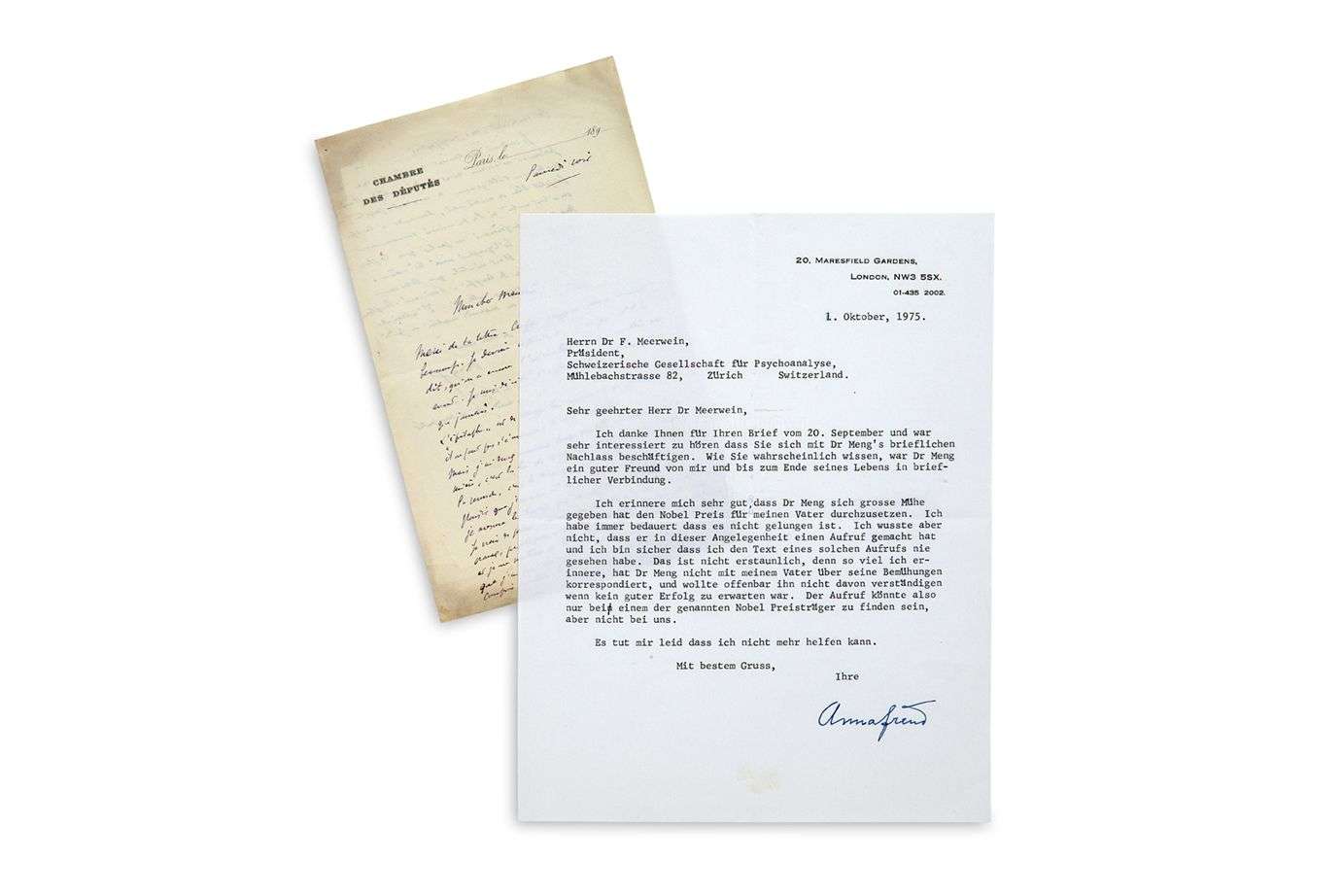 L.S. « Anna Freud », Londres 1er octobre 1975, au Dr F. MEERWEIN, Président de la Schweizerische Gesellschaft für Psychoanalyse | 1 page in-4 à son adresse | en allemand.