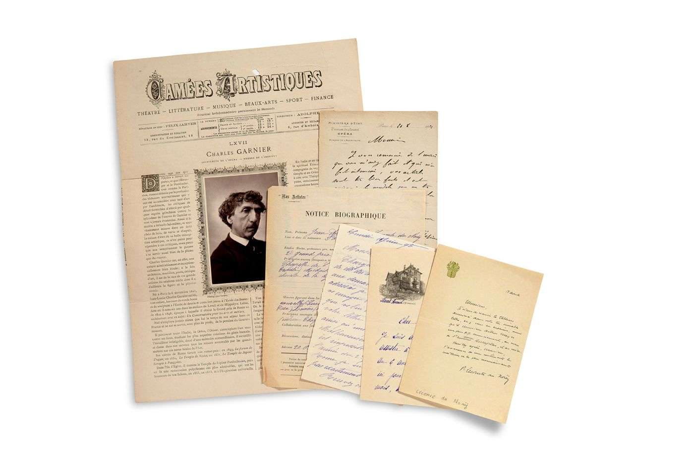 On joint un feuillet du journal Camées artistiques avec portrait photographique de Garnier | plus une l.a.s. de Pierre LECOMTE DU NOÜY, une l.a.s. d'Herminie LECOMTE DU NOÜY, et 2 doc. concernant le peintre J. Lecomte du Noüy.