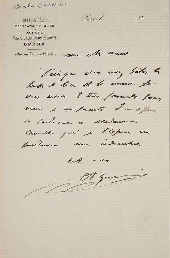L.A.S. « Ch. Garnier », Paris 187., à son ami Léon CARVALHO | ¾ page in-8, Ministère des Travaux publics. Agence des Travaux du Nouvel Opéra. Bureau de l'Architecte.
