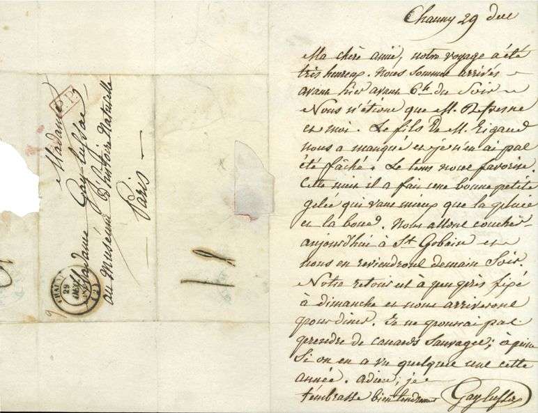 Il a fait un bon voyage avec M. Defresne : « Le fils de M. Rigaud nous a manqué et je n'en ai pas été fâché. Le tems nous favorise. Cette nuit il a fait une bonne petite gelée qui vaut mieux que la pluie et la boue. Nous allons coucher aujourd'hui à St Gobain et nous en reviendrons demain soir. Notre rtour est à peu près fixé à dimanche et nous arriverons pour diner. Je ne pourrai pas prendre de canards sauvages | à peine si on en a vu quelques uns cette année ». Il l'embrasse « tendrement ».