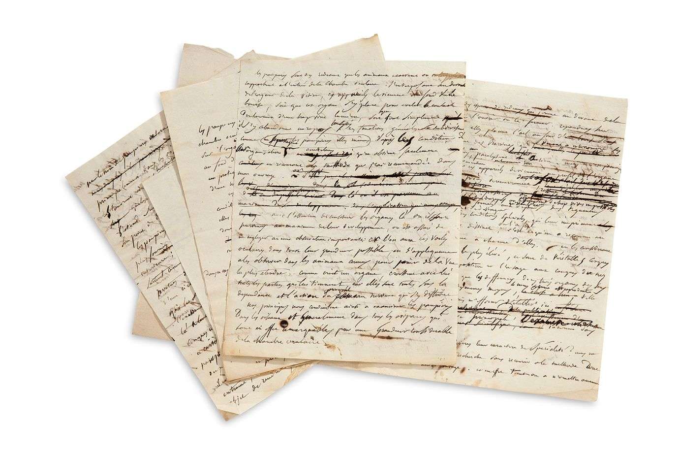Manuscrit scientifique de premier jet, avec ratures et corrections, et trois versions du début.