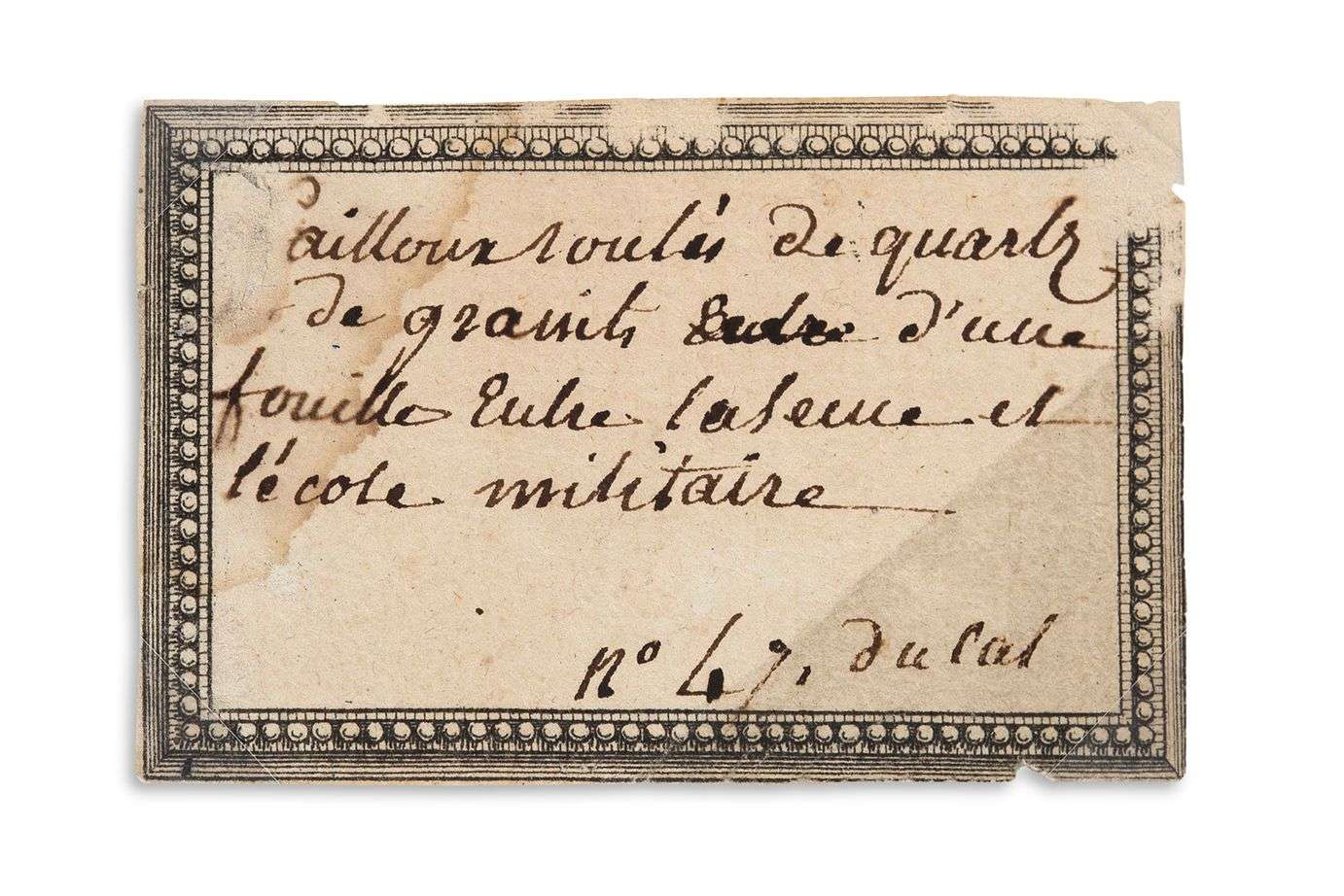 Étiquette d'échantillon minéral : « Cailloux roulés de quartz de granit d'une fouille entre la Seine et l'école militaire [actuel Champ de Mars].