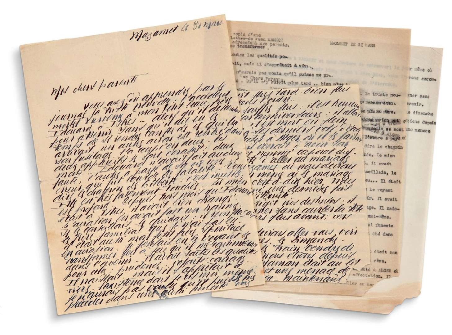 Il en était à ses derniers vols d'école. Je l'avais fait affecter à Alger où il se faisait une joie d'aller : il venait d'avoir son affectation, il était nommé caporal-chef. [...] Dieu régit nos destinées ! il faut savoir se résigner sans courber la tête et continuer toujours plus avant, vers l'avenir ""...