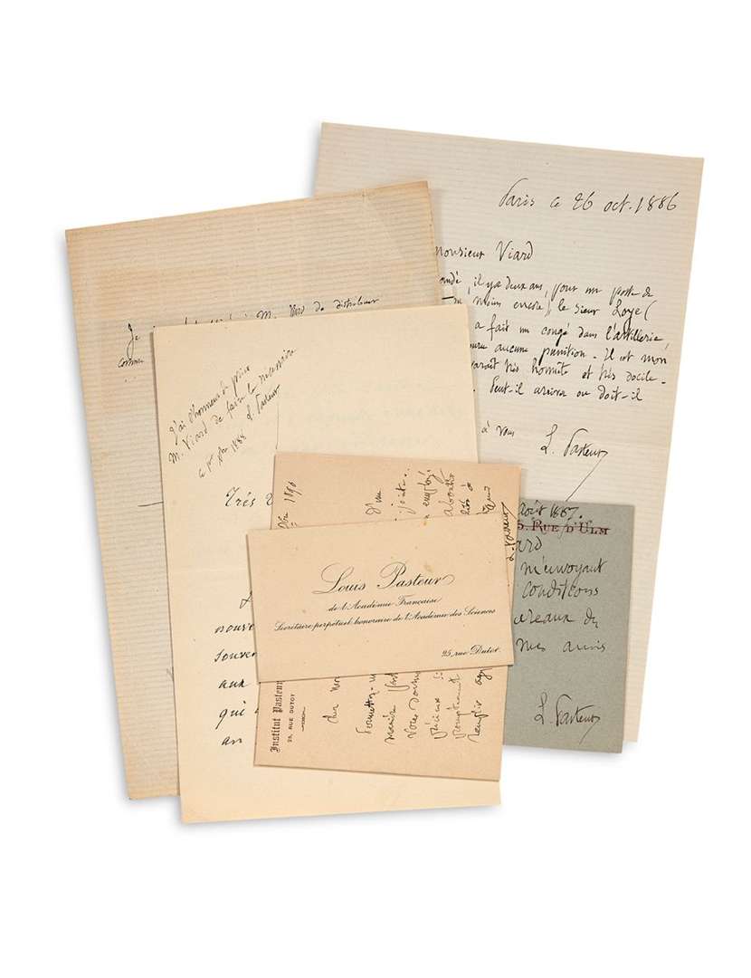Il est joint deux cartes autographes signées de Pasteur à Viard sur le même sujet, un billet autographe non-signé, un avis signé, et une lettre (6 octobre 1888) portant une apostille signée de Louis Pasteur datée du 1er décembre 1888. Et une carte de visite.