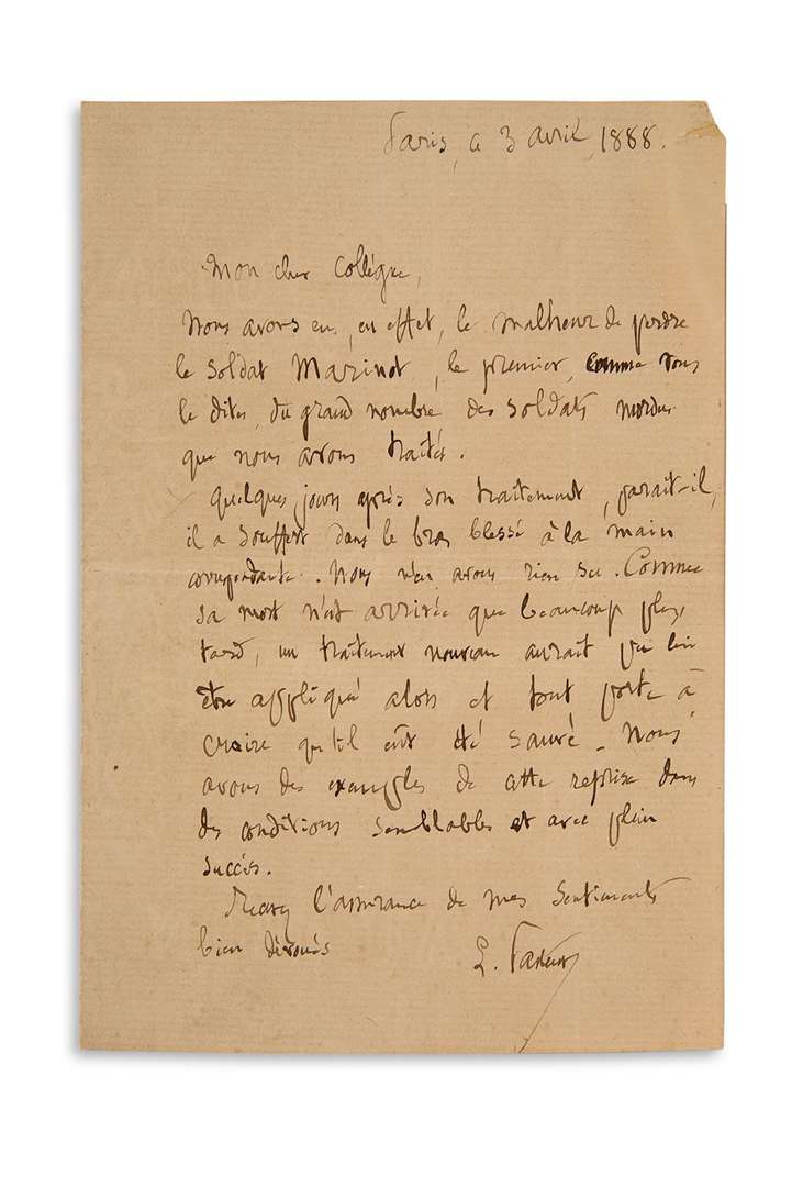 L.A.S. « L. Pasteur », Paris 3 avril 1888, à un collègue | 1 page in-8 (petite déchirure au coin sup. droit).