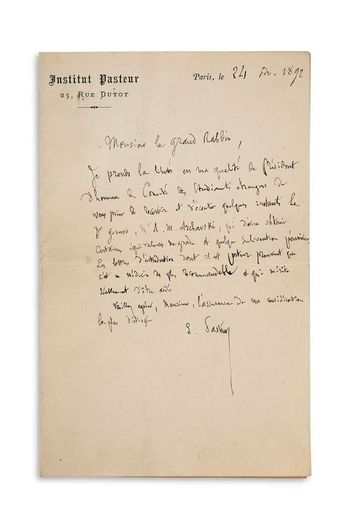 En sa qualité de Président d'honneur du Comité des Étudiants étrangers, Pasteur prie le Grand Rabbin de recevoir « le Dr Genevois, Mr A. M. Archavski, qui désire obtenir certaines équivalences de grade et quelque subvention pécuniaire. Les lettres d'introduction dont il est porteur prouvent que c'est un médecin des plus recommandable et qui mérite réellement d'être aidé »...