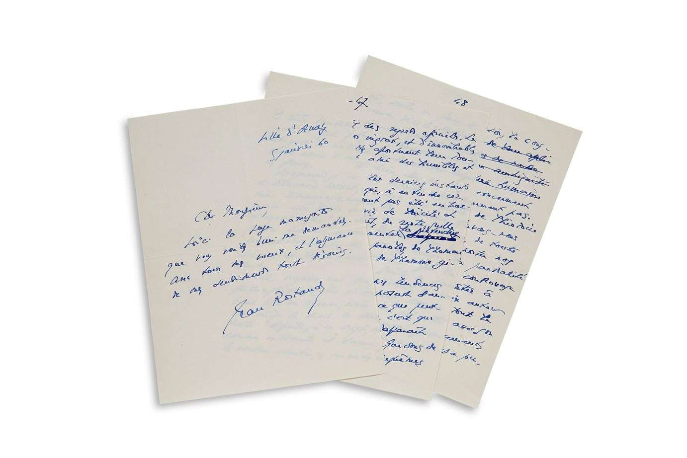 L.A.S. « Jean Rostand », Ville d'Avray 5 janvier 1960, et MANUSCRIT autographe, [1959] | 1 et 2 pages in-4 à l'encre bleue.