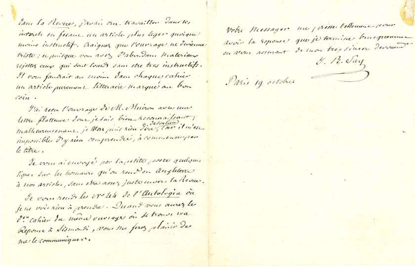 Il explique au directeur de la Revue encyclopédique pourquoi son nom figure parmi les collaborateurs de la Revue européenne, mais seulement pour l'édition anglaise, car il n'y donnera pas d'articles « qui puissent être traduits & insérés dans l'édition française. Il travaille à « l'article tiré de l'Antologia sur les Grecs », qu'il donnera pour le cahier de novembre.