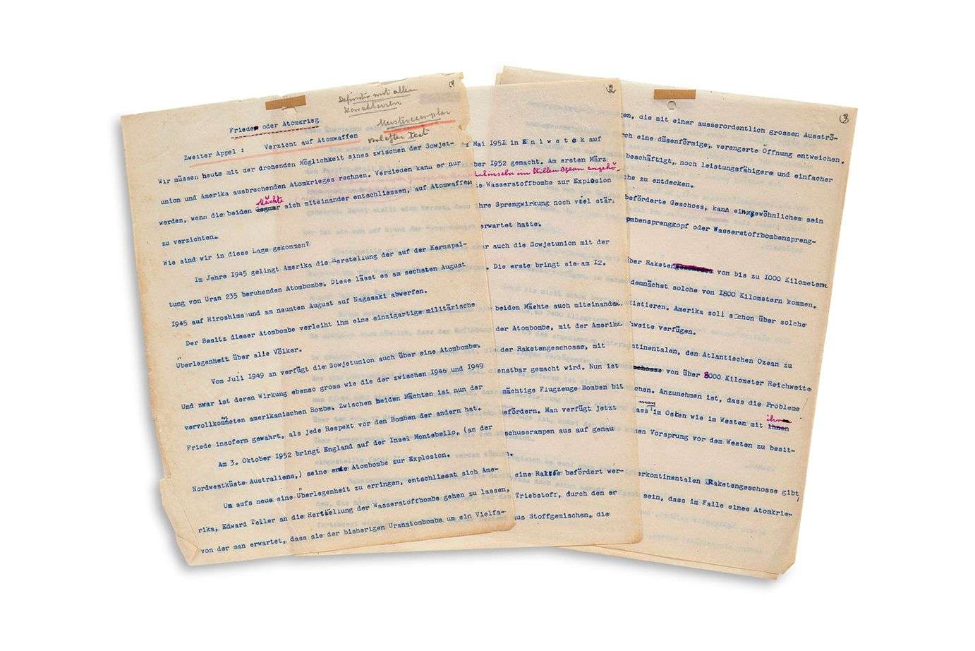 TAPUSCRIT avec CORRECTIONS autographes, Friede oder Atomkrieg, [vers 1957-1958] | 19 pages in-4 dactylographiées | en allemand.