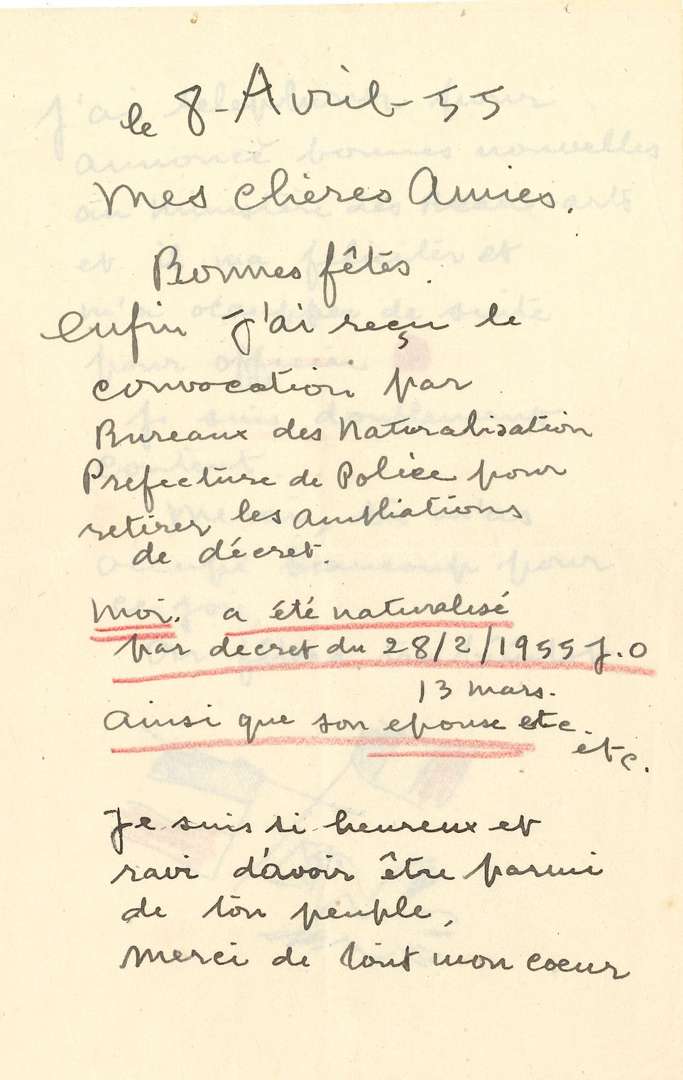 Grosjean raconte son amitié avec Foujita (Paradox, 2018).] 8 avril 1955, annonçant joyeusement sa naturalisation française et celle de son épouse... « J'ai telephoner pour annoncè bonnes nouvelles au ministère des Beaux-arts et il m'a feliciter et m'a occupper de suite pour officier [rond rouge] »... Dessin colorié de deux drapeaux tricolores avec un pigeon tenant une lettre. 28 décembre 1955 : « Nous dinnons chez moi en quatre, bon geulton, ça manque de ta guele »... 7 avril 1957, illustrée d'un dessin représentant un bouquet de fleurs rehaussé de couleurs. Chagrin pour la mort de « Zouzou bien aimé [...] si fidèle et si obéissant. Il est invité par René Coty à Versailles : « Je fait faire jaquette chapeau chemise cravate etc. Je peux voir la reine tout prêt c'est un grand honor »... 13 mai [1957]. « Enfin depuis l'hier mon atelier devient en ordre très bien et je puis travailler aujourd'hui même. Je dois travailler beaucoup maintenant »... 24 septembre 1962, expliquant comment venir de Paris jusqu'à son atelier à Villiers le Bâcle près de Gif.