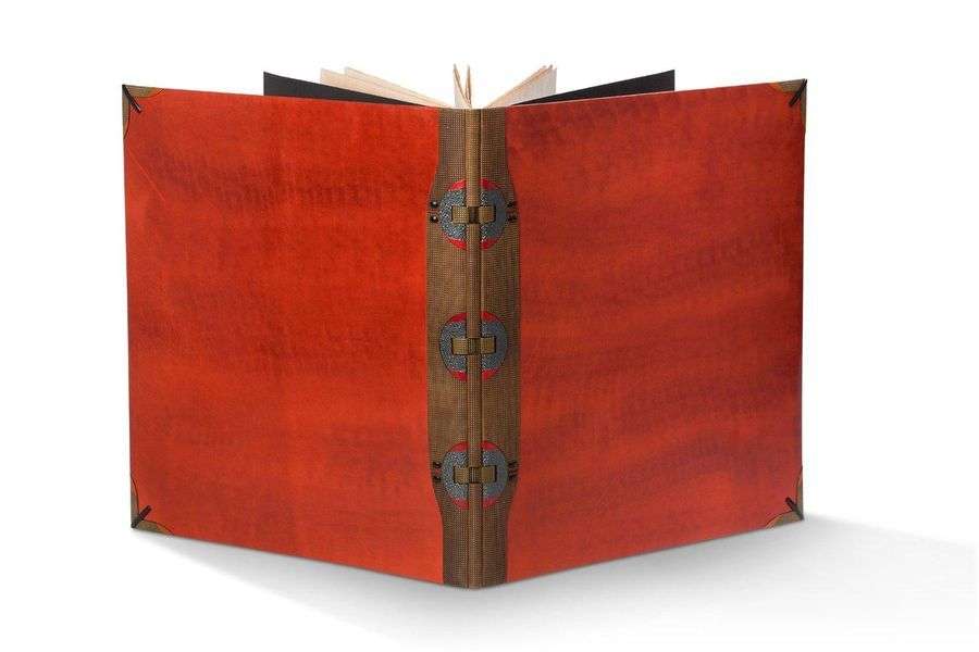 Paris, chez Paul Poiret, 1908. In-4 carré (316 x 283 mm). Plein veau acajou poli à l'agate, baguette d'ébène en angles sur veau olive, au mors, bordure en veau aniline olive gaufré et riveté, pièces de mors en galuchat, dos en veau aniline olive gaufré, doublure de nubuck taupe, premier plat de couverture, boîte à dos de veau titrée (Jean de Gonet, 1991).