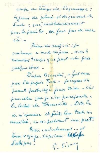 L.A.S. «P. Signac», Jeudi [Lézardrieux 24 août 1923], à Henri DONIAS, à Paris| 2 pages in-8, en-tête Société des Artistes indépendants, enveloppe.