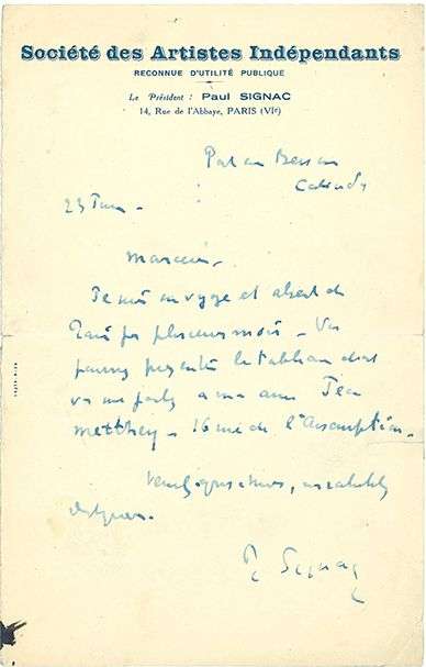 762 SIGNAC Paul (1863-1935). L.A.S. « P. Signac », Pont-en-Bessin (Calvado