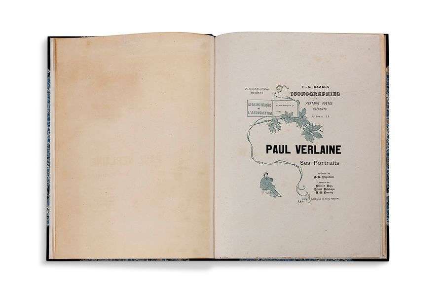 Un des 7 exemplaires sur Chine (n°5) numéroté avec la double couverture estampée signée par Maurice Dumont et comportant 3 épreuves encartées en sanguine, sépia et bistre ainsi que la lithographie « Les sanglots long... » signée par Cazals. Les portraits de Paul Verlaine par
